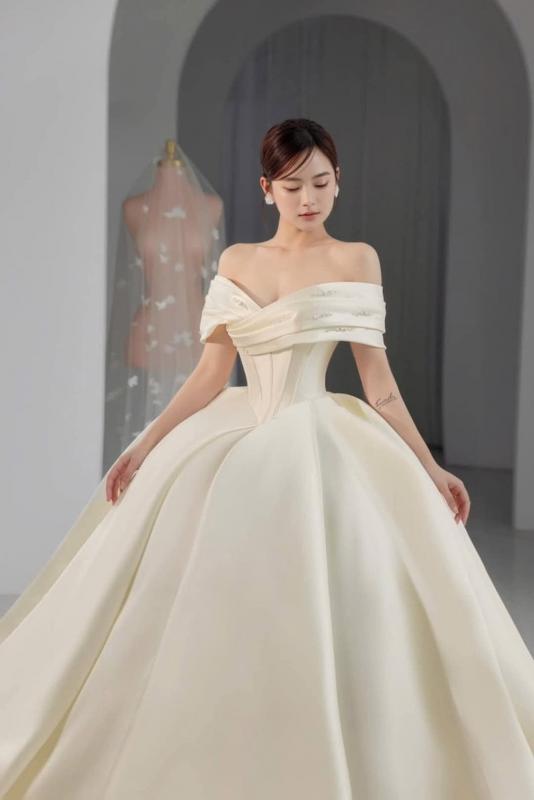 Váy cưới satin mang lại vẻ sang trọng, quý phái mà vẫn thời thượng. Nàng dâu chỉ cần một chiếc váy satin tinh khôi cũng đủ chiếm trọn spotlight trong ngày cưới."