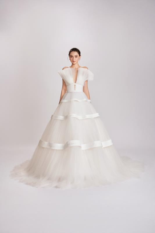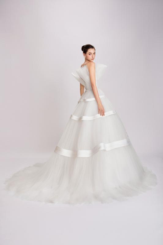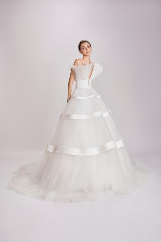 Trên nền tulle trong suốt, từng lớp váy được xếp chồng khéo léo, tạo nên độ bồng bềnh như sương mây. Thiết kế ball gown được dựng phom hiện đại với phần corset cúp ngực sweetheart neck thanh thoát, giữ trọn nét tối giản nhưng đầy tinh tế. Chi tiết nổi bật nhất chính1