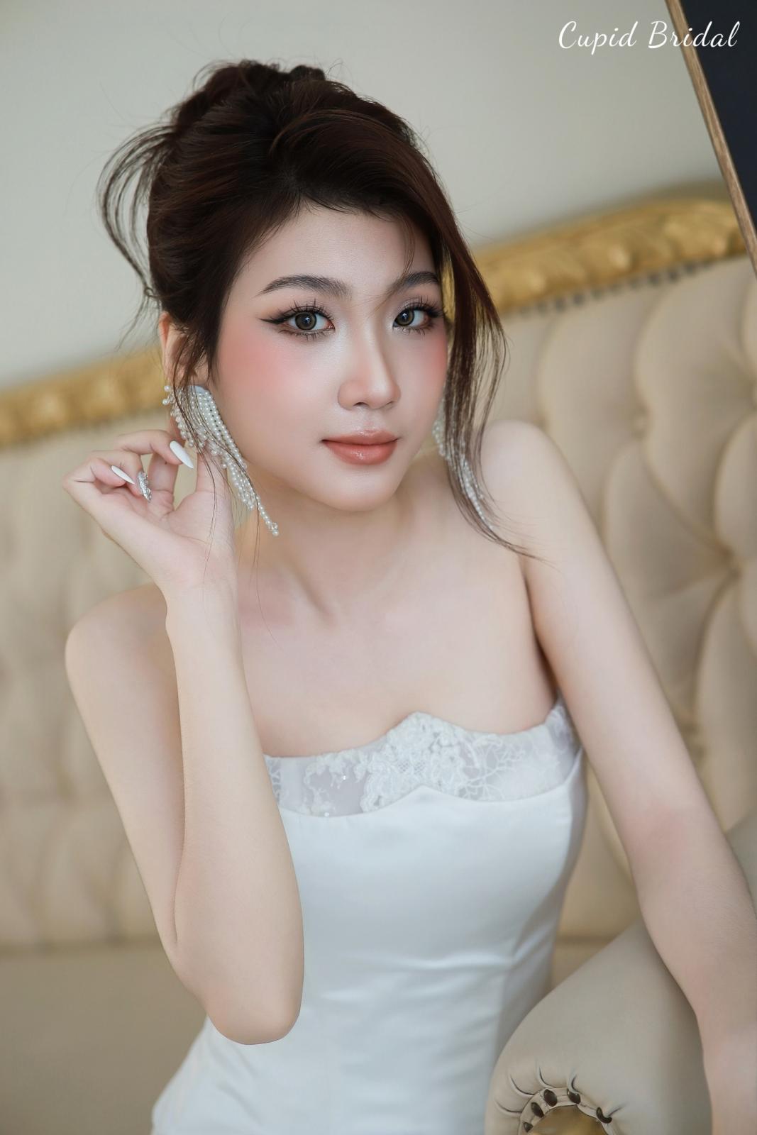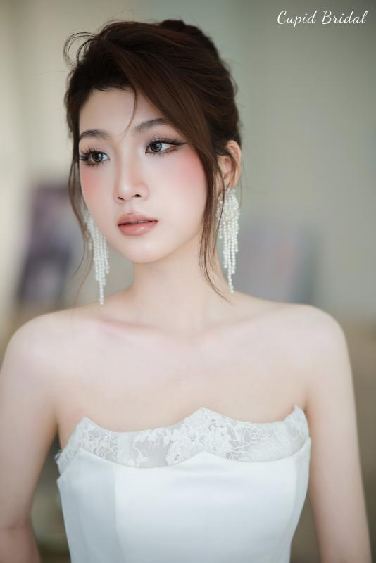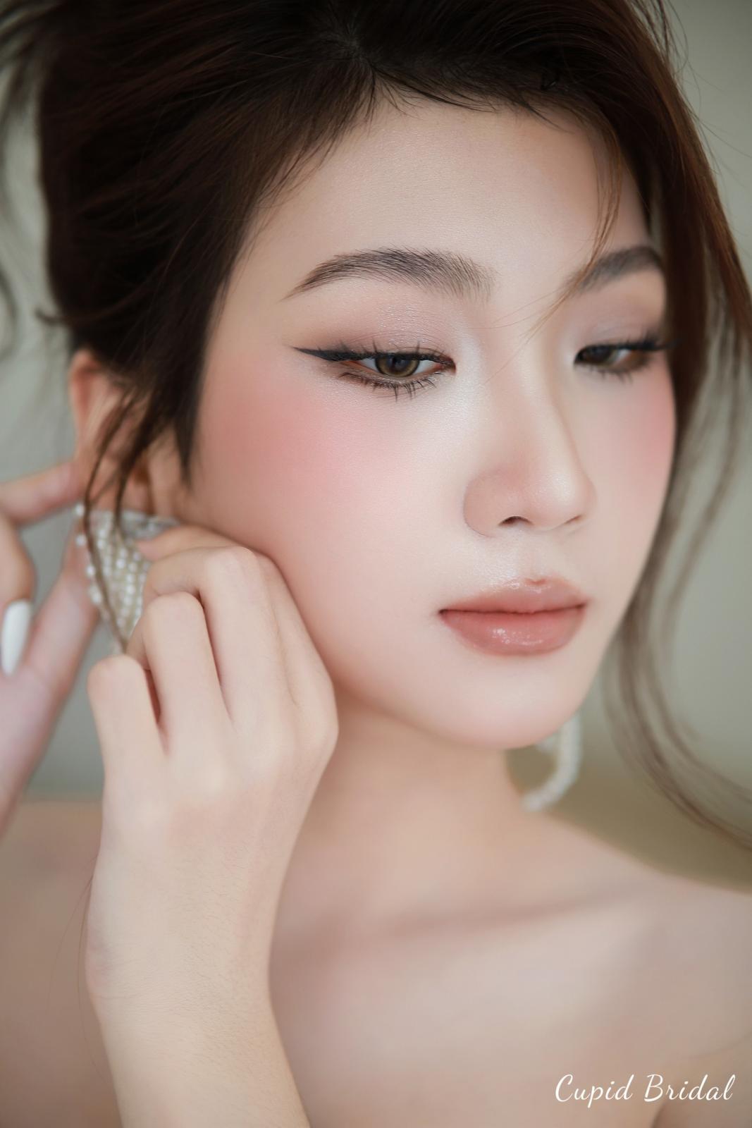 Lớp nền mỏng nhẹ, căng bóng . Đôi mắt được điểm xuyết bởi sắc nâu – hồng dịu dàng, đường eyeliner khẽ kéo dài, khiến ánh nhìn thêm sâu và đầy cuốn hút. Một chút má hồng đào phớt nhẹ, hòa quyện cùng ánh highlight trên gò má khiến nàng như mang theo cả ánh nắng ban mai trên gương mặt. Màu son cam đất pha hồng đào tô điểm đôi môi, vừa ngọt ngào vừa hiện đại, đủ để làm bừng sáng nụ cười trong khoảnh khắc hạnh phúc.
