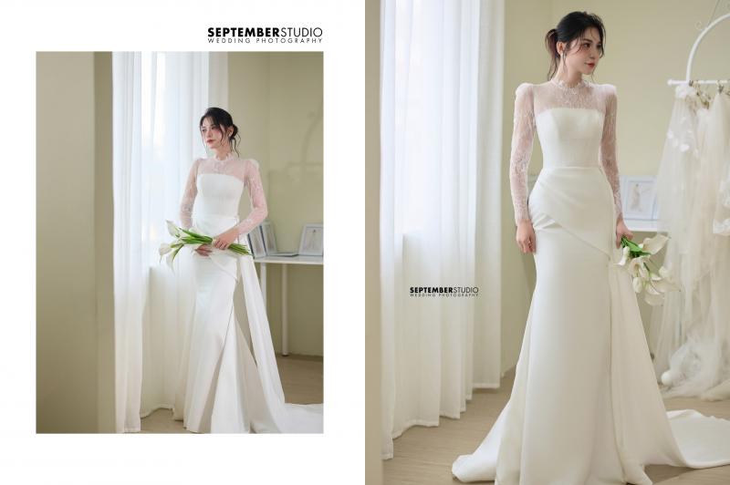 Đường xẻ tà mềm mại mở ra dáng hình uyển chuyển, giúp nàng di chuyển dễ dàng, gây ấn tượng trong phần after party. Găng tay lụa trắng phối cùng vòng ngọc trai tinh khôi giúp nàng trở thành “nàng thơ” rực rỡ trong ngày hạnh phúc.