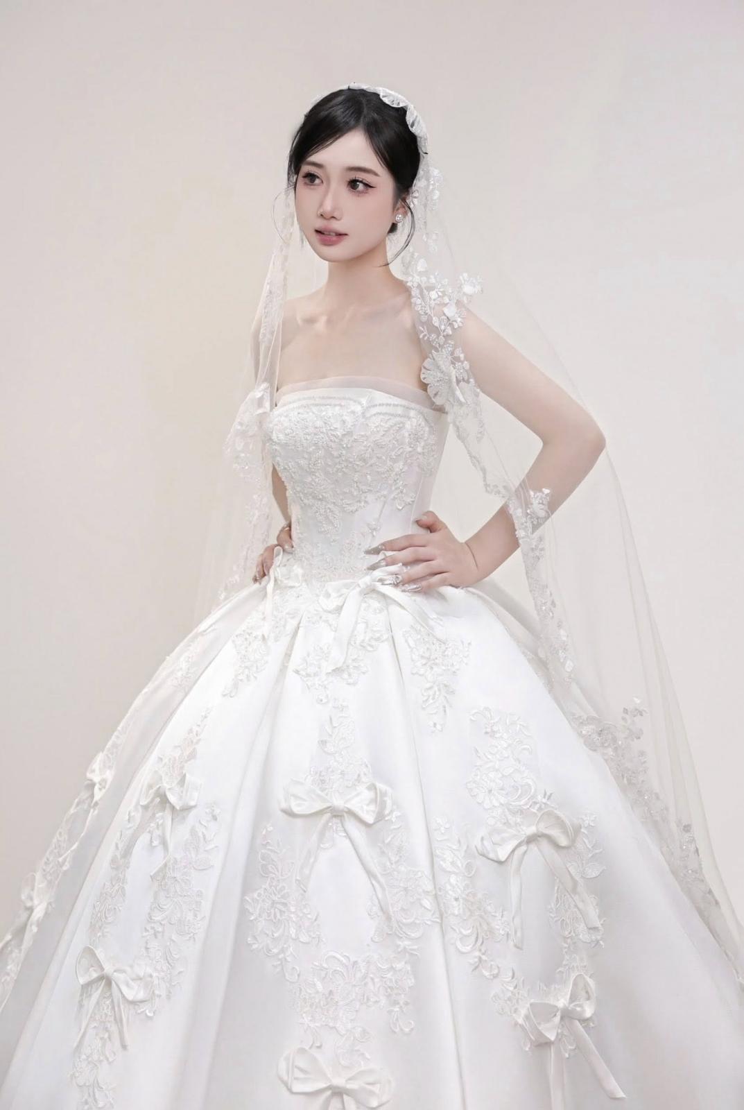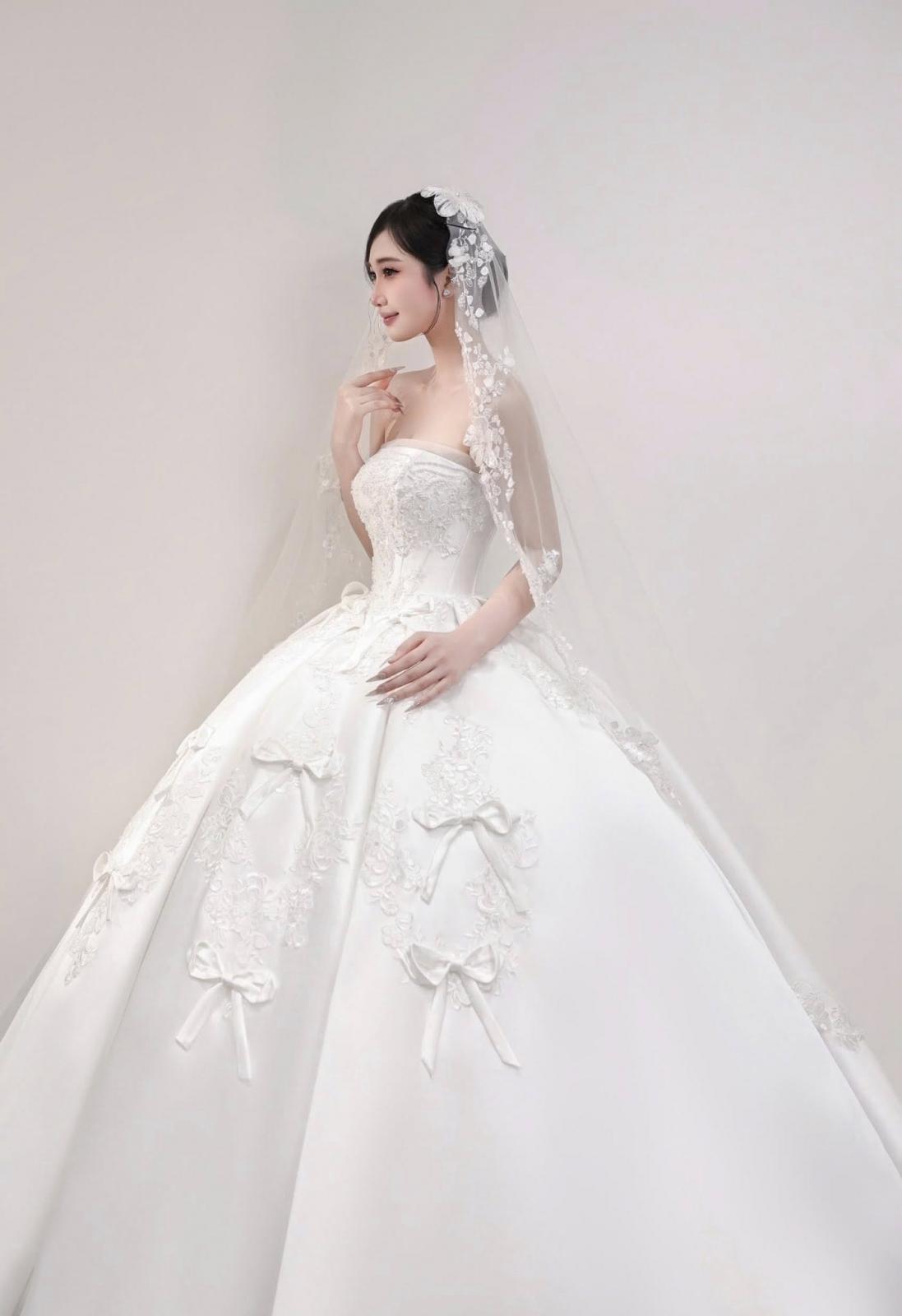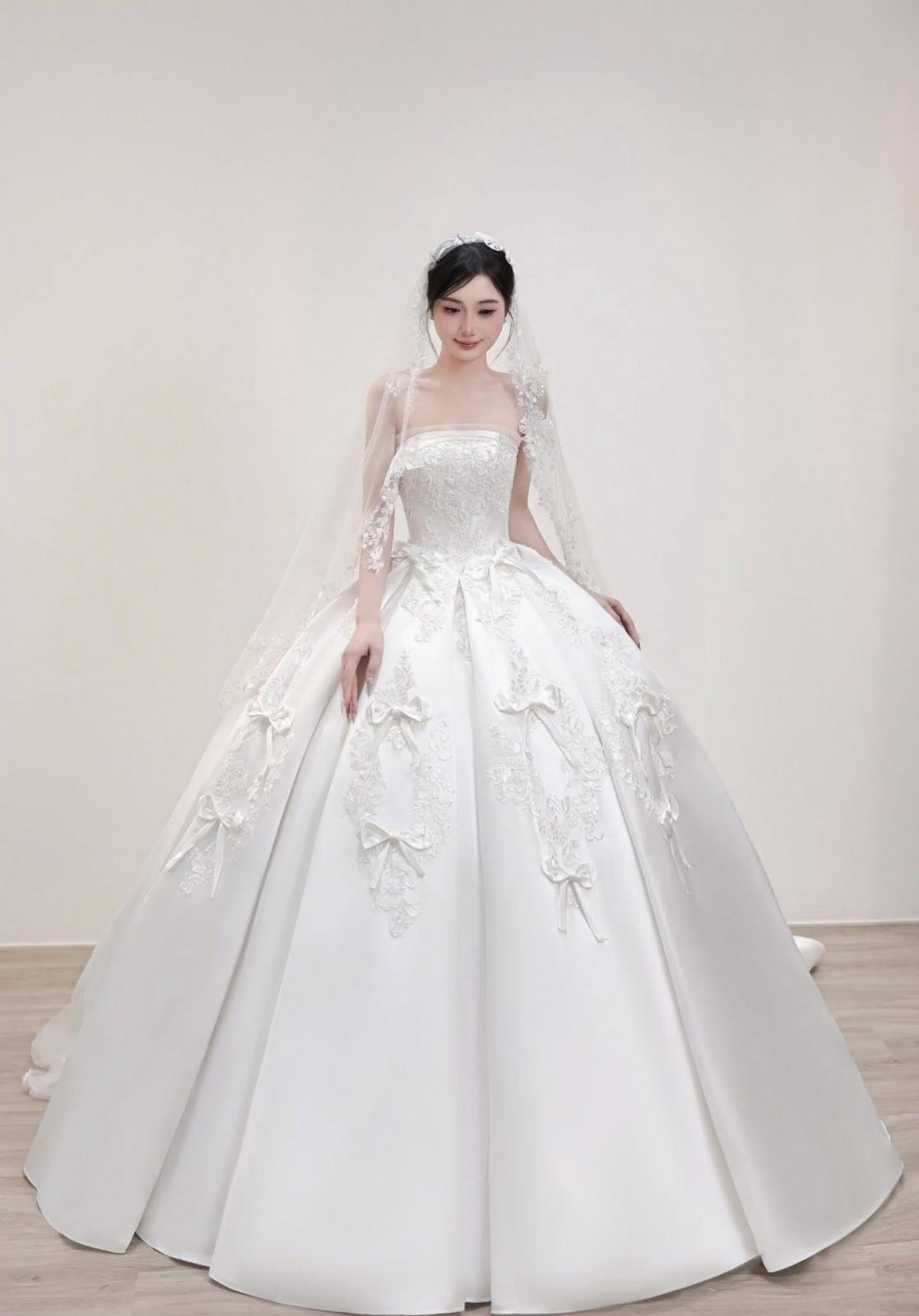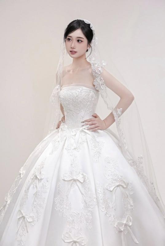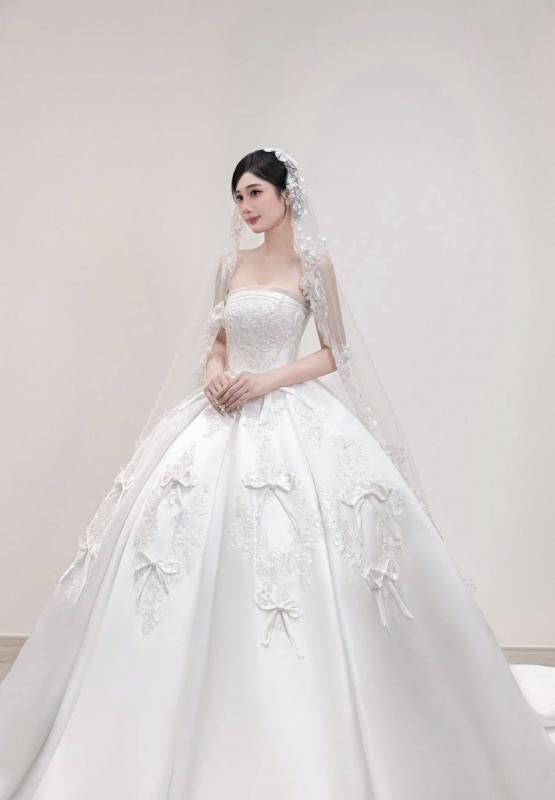 Váy cưới với thiết kế corset ôm sát, tôn trọn đường cong quyến rũ, được phủ ren thêu tỉ mỉ đầy nghệ thuật. Chân váy bồng xoè với nhiều tầng voan mềm mại, tạo hiệu ứng bay bổng như mây. Đây là lựa chọn hoàn hảo cho cô dâu mong muốn sự thanh lịch, sang trọng và đẳng cấp trong ngày trọng đại.