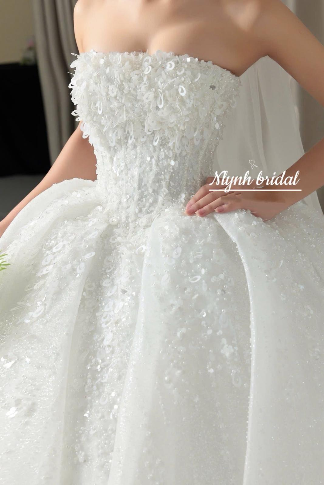 Thiết kế phom váy đuôi cá được dựng phom công phu, khéo léo tôn vinh vóc dáng thon gọn và đường cong mềm mại của nàng dâu. Phần thân trên sử dụng cấu trúc corset kết hợp đường xẻ chữ V tạo nên sự cân bằng hài hòa giữa nét gợi cảm hiện đại và vẻ sang trọng vượt thời gian. Chất liệu ren ép kim sa được thêu kết thủ công tỉ mỉ, phủ kín bề mặt bằng hiệu ứng ánh sáng lấp lánh, tựa những hạt sương tinh khiết khẽ bắt sáng theo từng chuyển động.