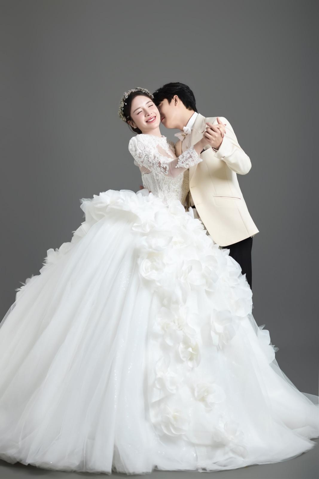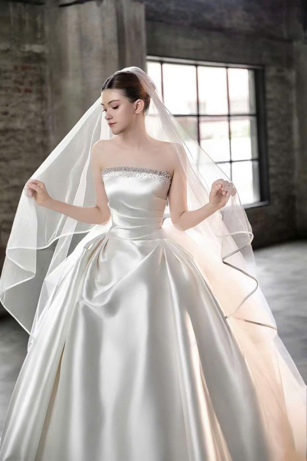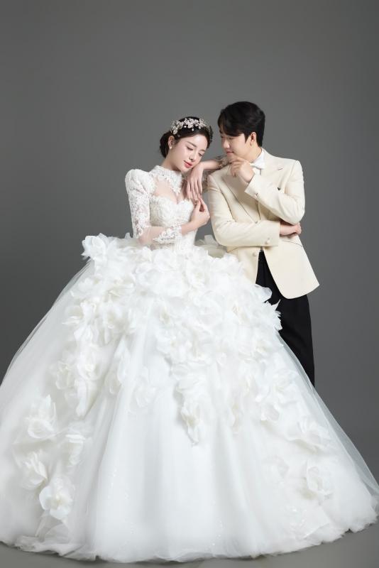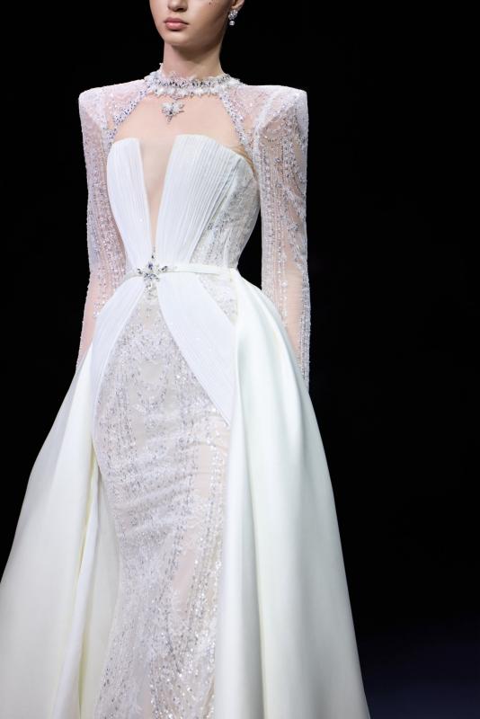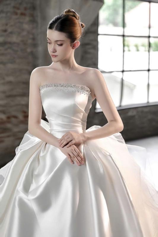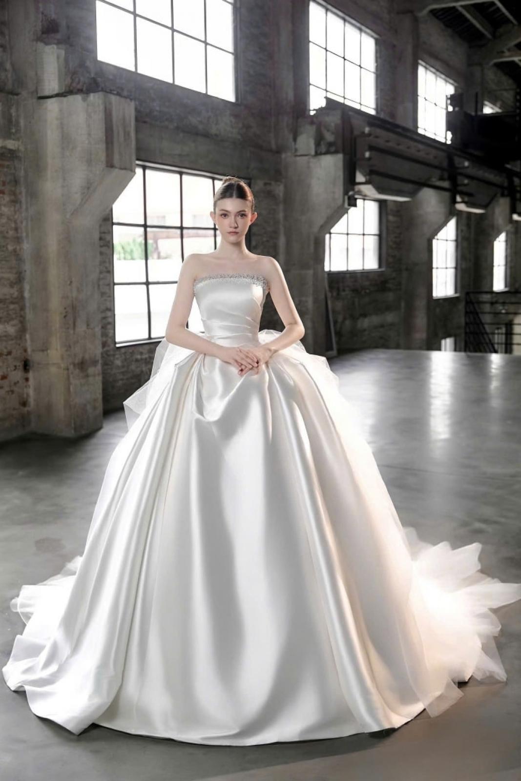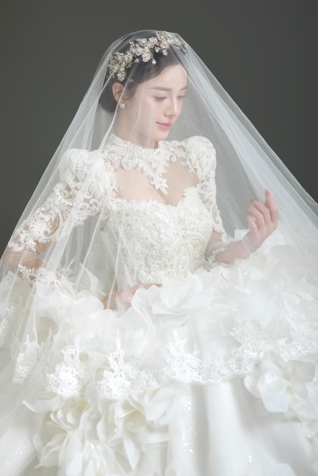 Điểm nhấn đặc biệt nằm ở áo choàng rời, được xử lý như hai dải lụa mềm mở rộng dáng váy, tạo nên hiệu ứng chuyển động uyển chuyển theo từng bước đi. Chi tiết này mang đến sự linh hoạt trong tạo hình, cho phép nàng dâu biến hóa phong cách từ vẻ trang trọng, bề thế khi bước vào lễ đường đến sự tinh giản, thanh thoát trong ngày trọng đại.