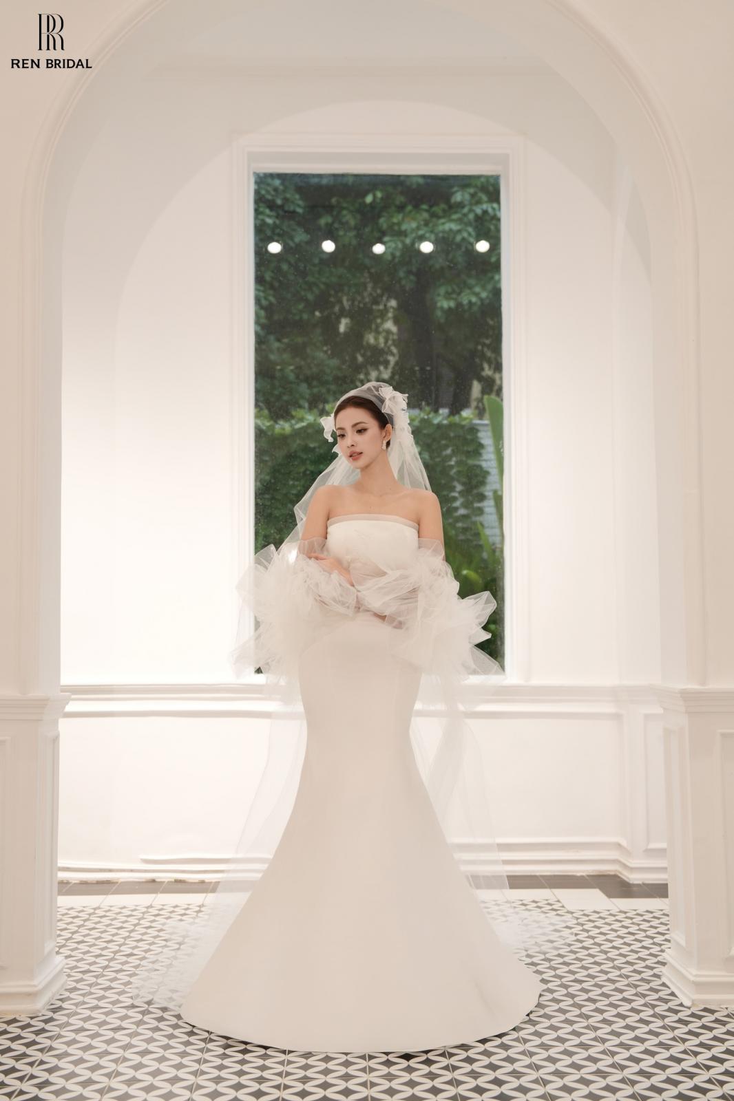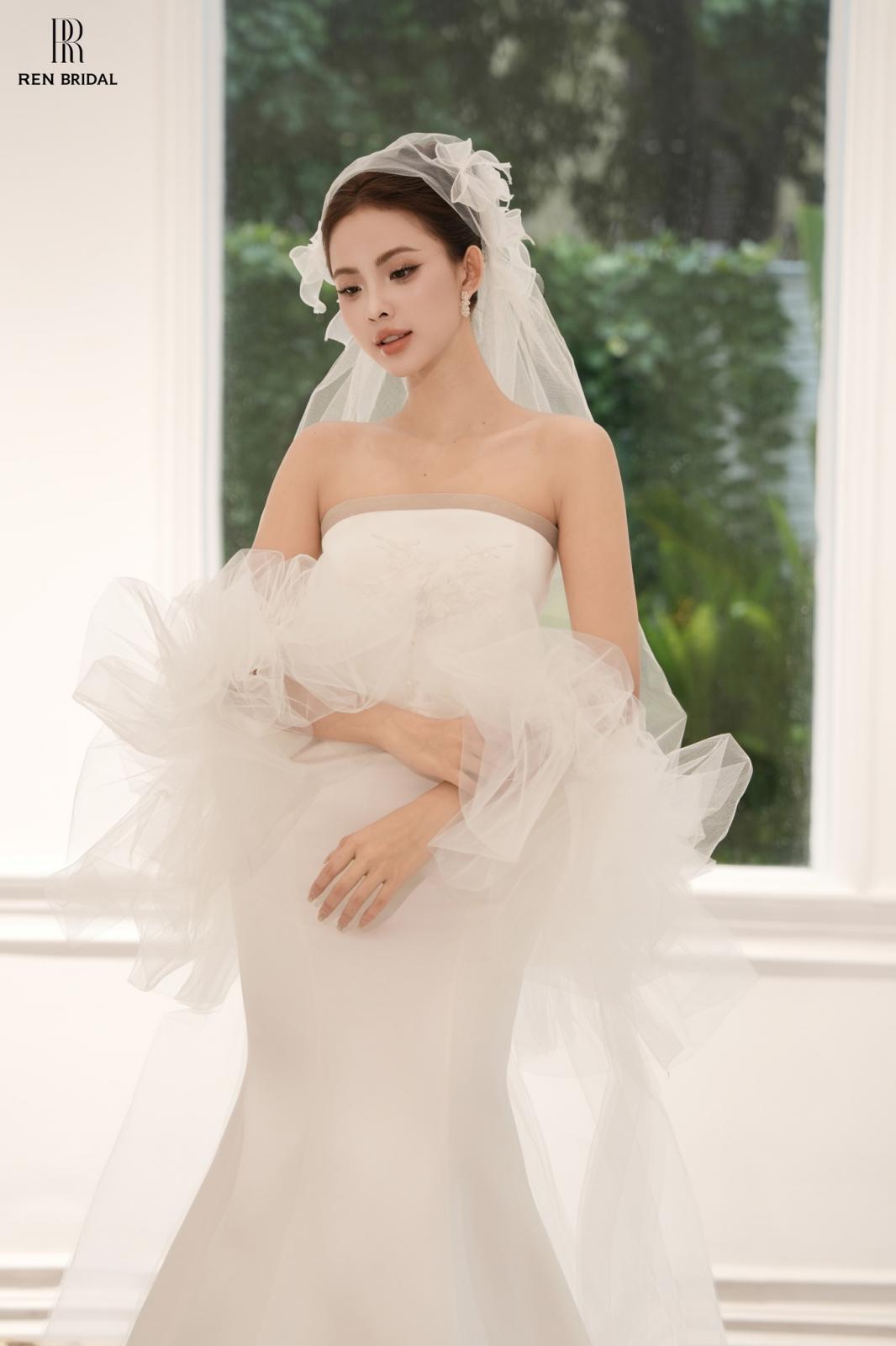 Thiết kế đuôi cá satin trơn, điểm xuyến chi tiết đính kết tinh tế nơi ngực, kết hợp cùng lớp voan mềm mại – khắc họa hình ảnh nàng dâu thanh khiết và đầy cuốn hút.