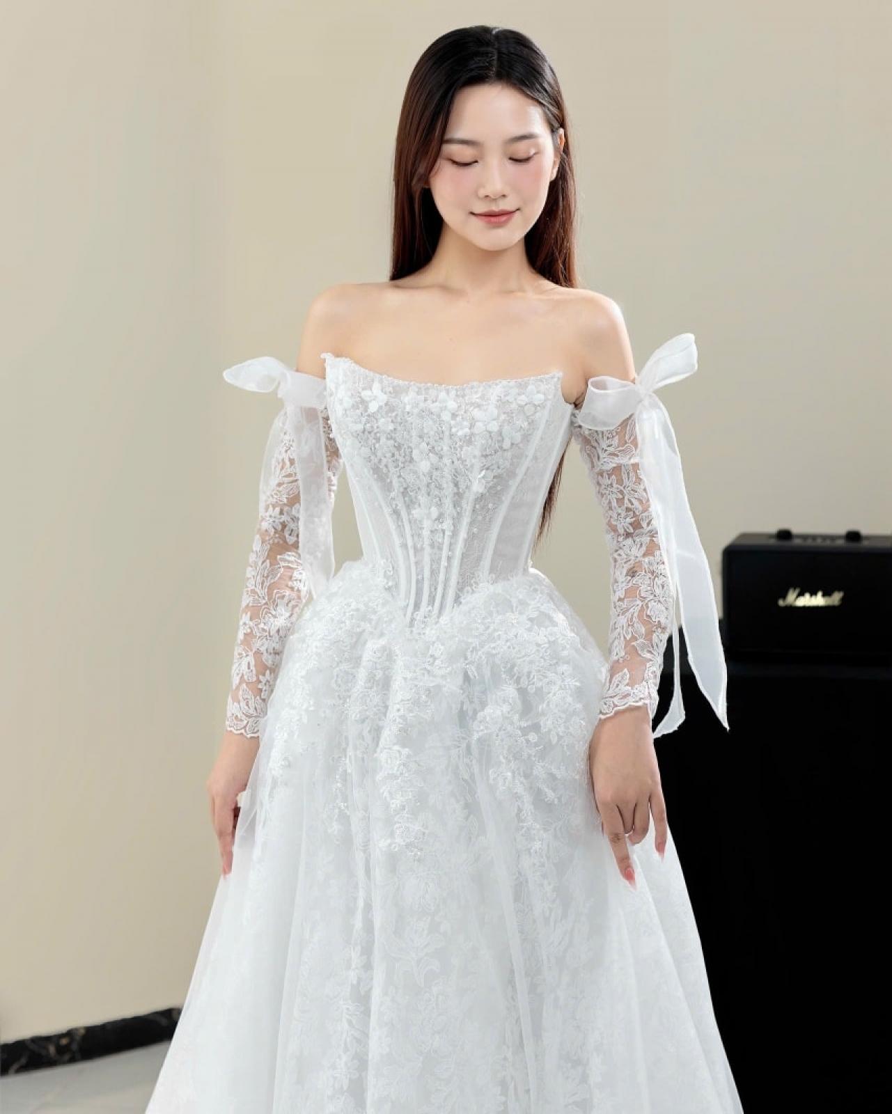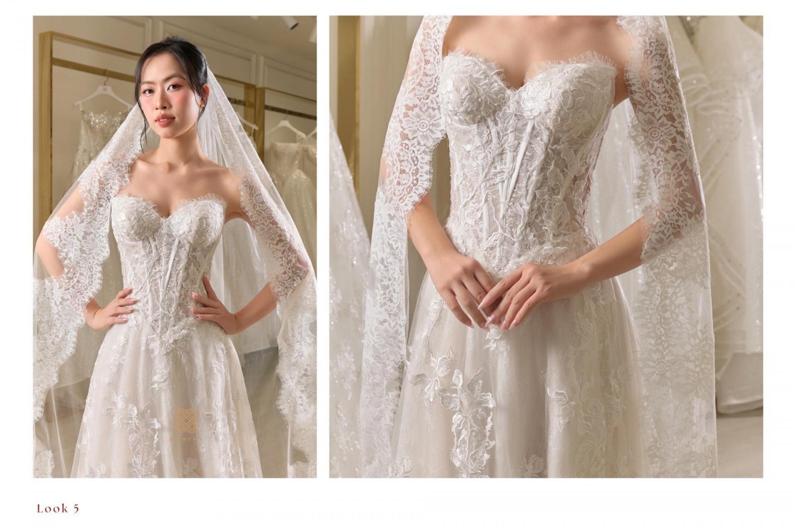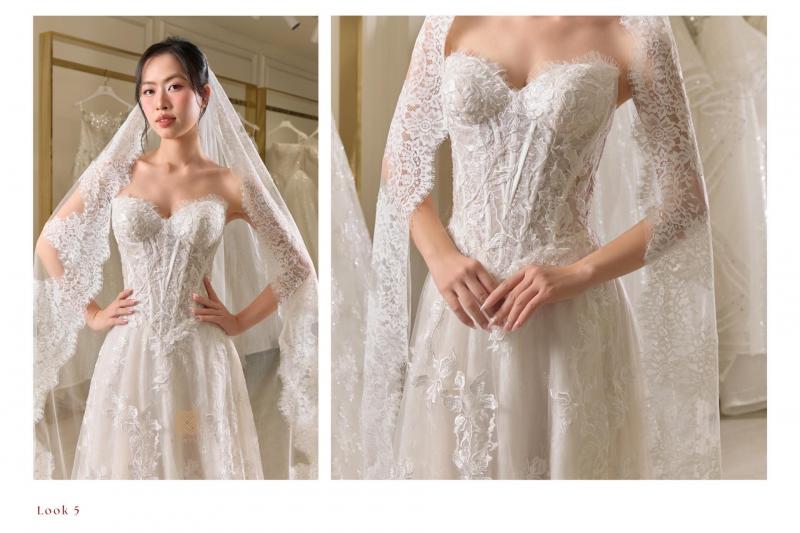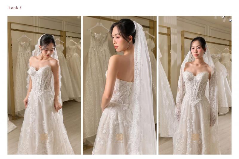 Look 5 là lựa chọn dành cho những nàng dâu yêu vẻ đẹp tinh tế, sang trọng nhưng vẫn giữ trọn nét thuần khiết và lãng mạn – một khoảnh khắc rực rỡ, nhẹ tênh và đầy cảm xúc khi bước vào lễ đường 🤍✨