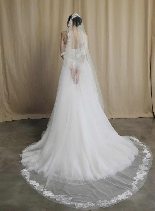 Thiết kế váy cưới dáng suông A line, sử dụng chất liệu ren cao cấp kết hợp cùng form dáng corset ôm nhẹ phần thân trên, giúp tôn trọn vòng eo thon gọn và đường nét nữ tính của cô dâu. Phần ngực tạo dáng cúp tim mềm mại,1