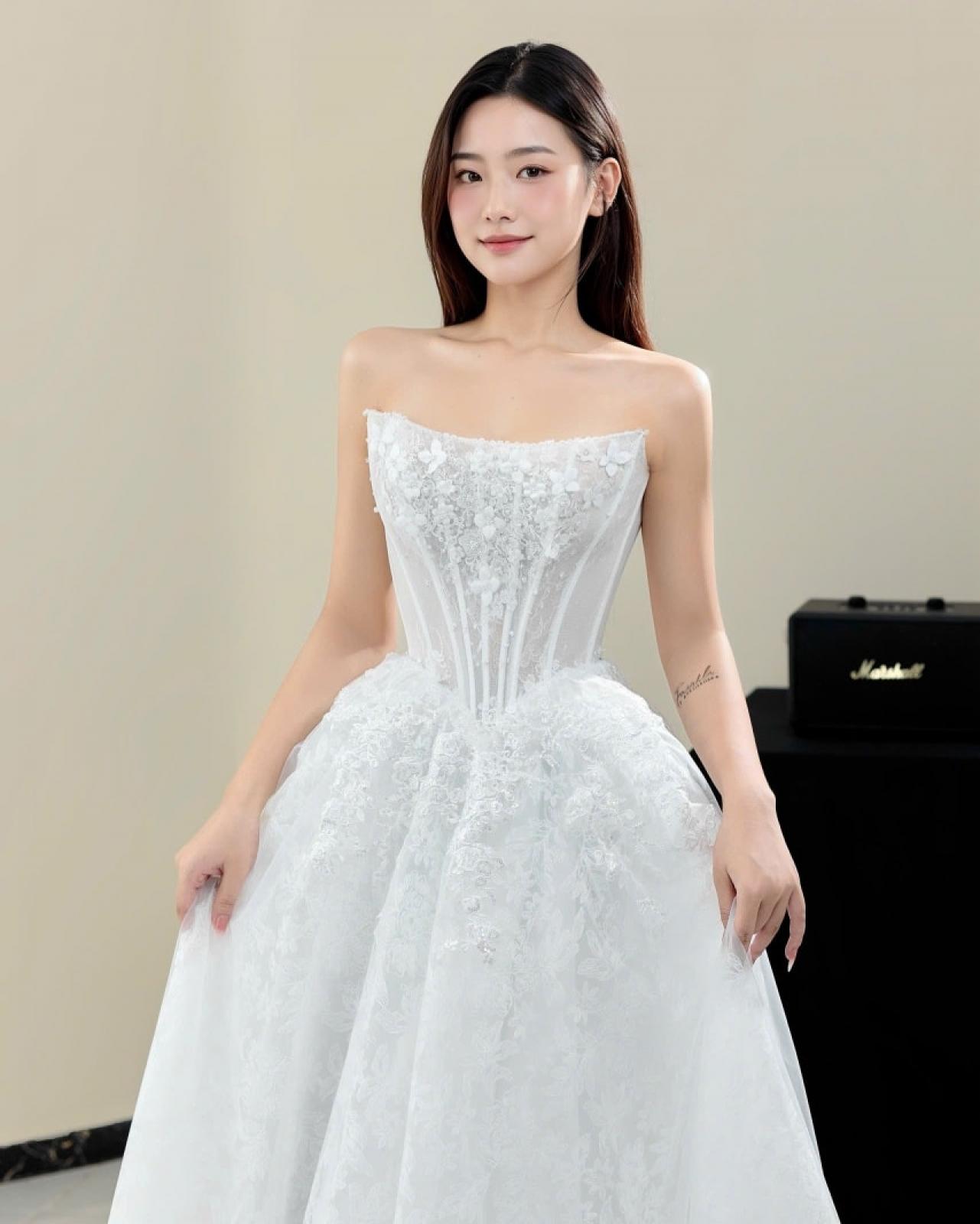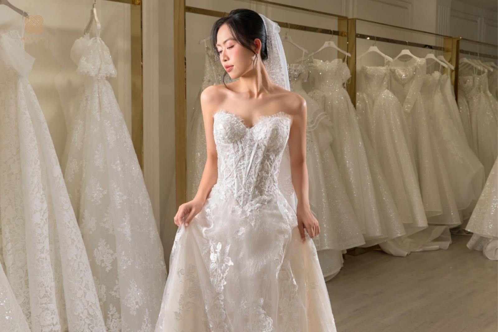 Thiết kế váy cưới dáng suông A line, sử dụng chất liệu ren cao cấp kết hợp cùng form dáng corset ôm nhẹ phần thân trên, giúp tôn trọn vòng eo thon gọn và đường nét nữ tính của cô dâu. Phần ngực tạo dáng cúp tim mềm mại, xử lý tinh tế để vừa quyến rũ vừa giữ được sự thanh lịch cần có trong ngày trọng đại.