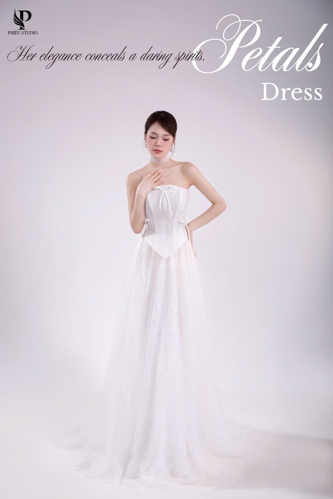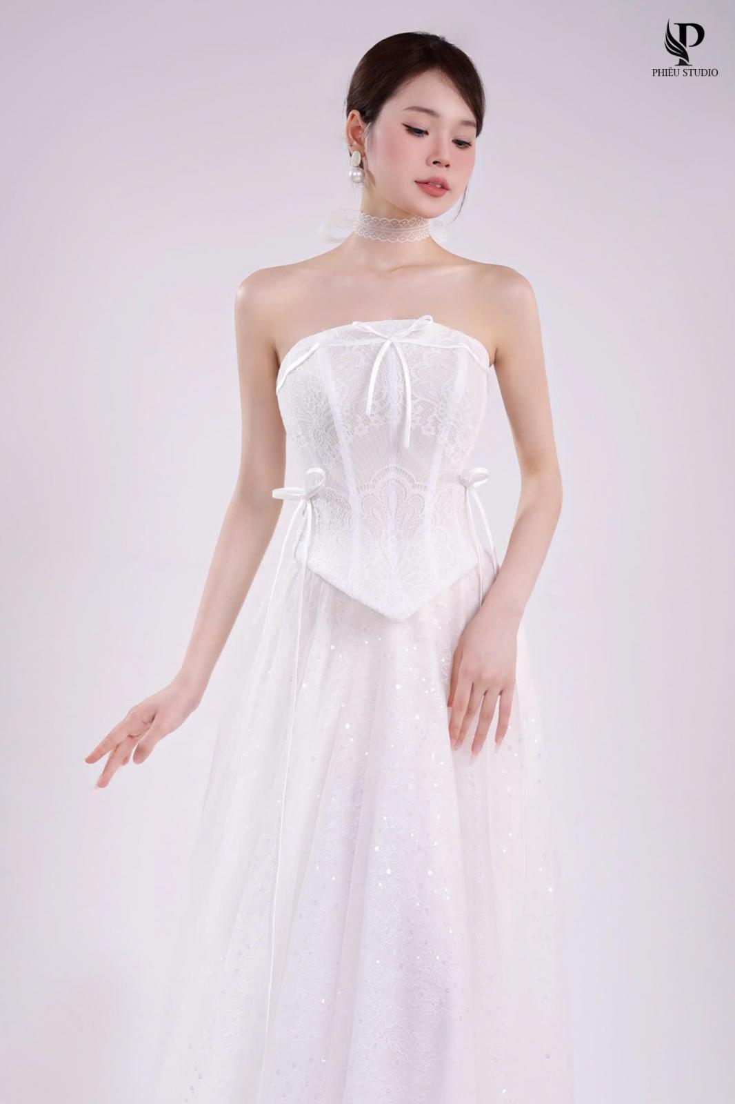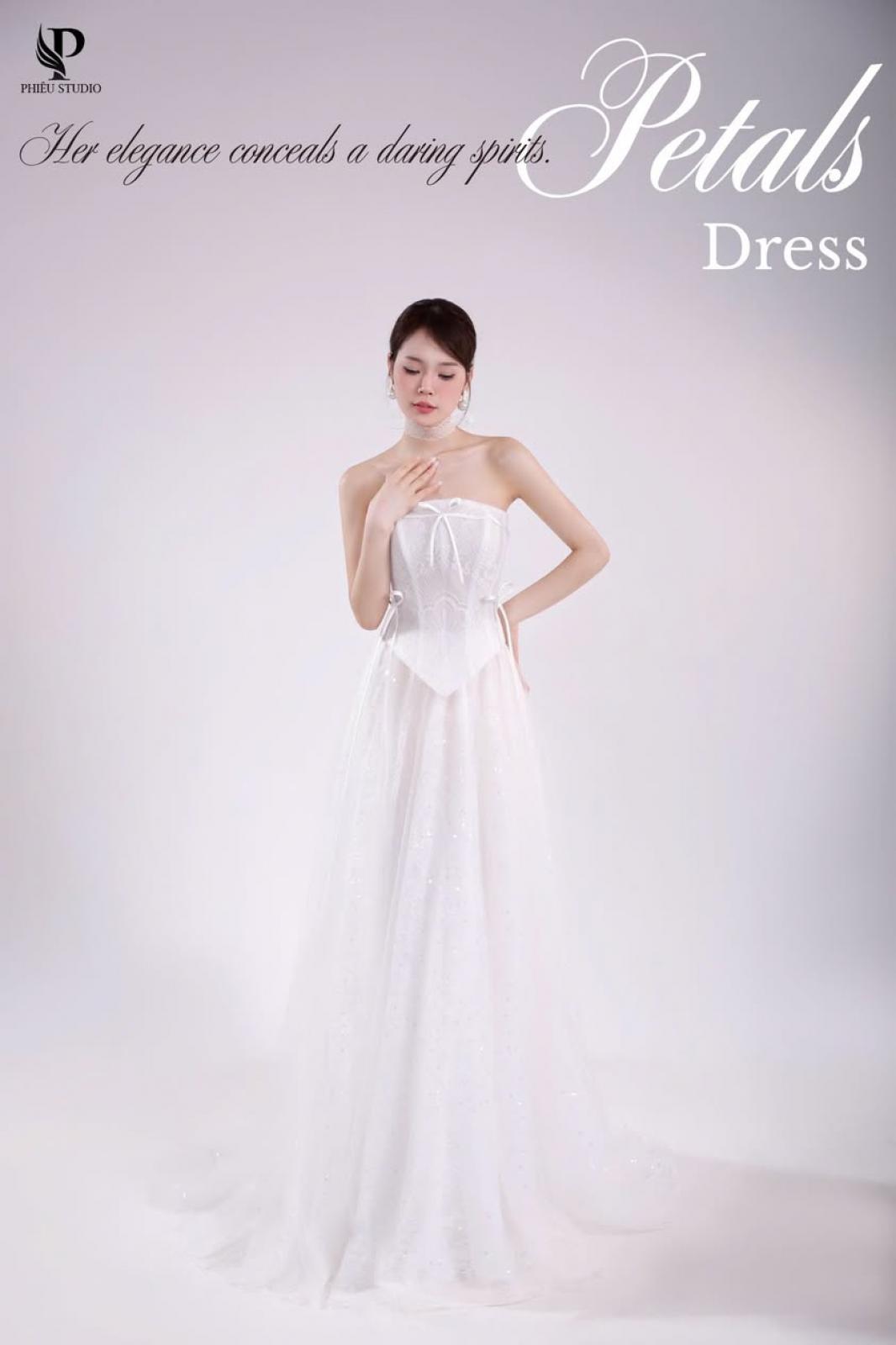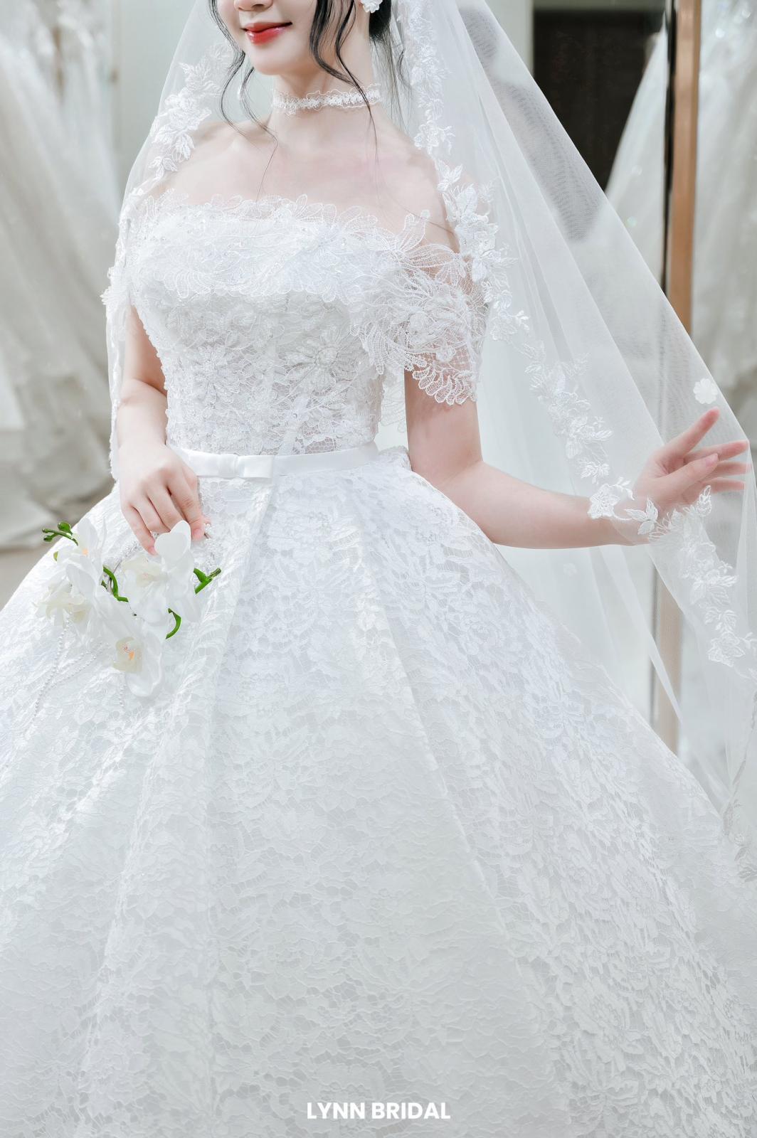 Như ánh ban mai khẽ chạm lên cánh hoa, SERAPHINE bước vào không gian cưới với dáng ren mềm mại, ôm lấy từng đường nét thanh thoát. Thiết kế trễ vai kết hợp corset tôn dáng, mang đến vẻ kiêu sa nhưng vẫn giữ được sự dịu dàng.