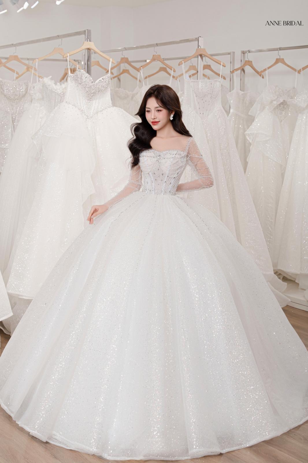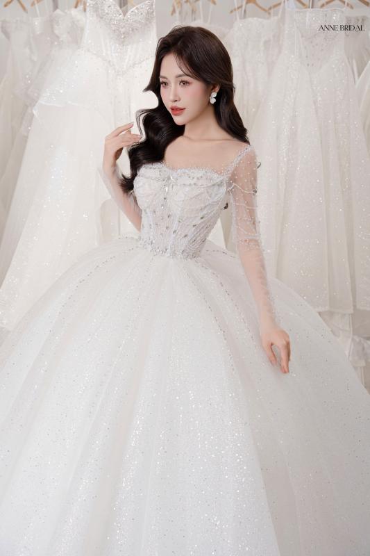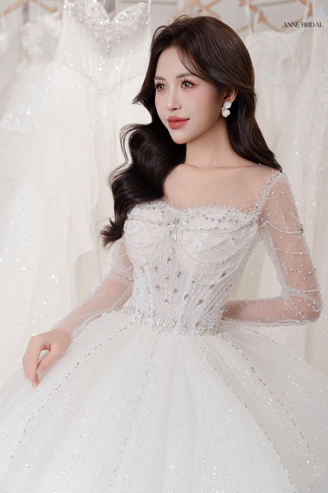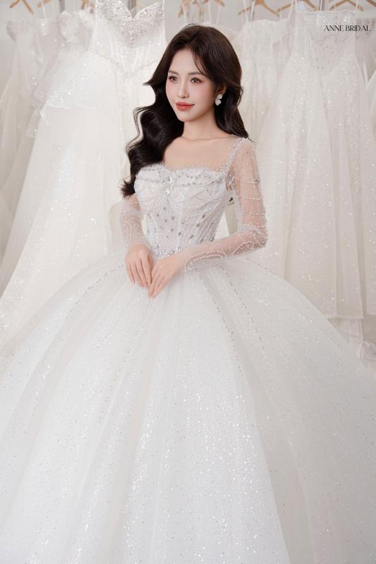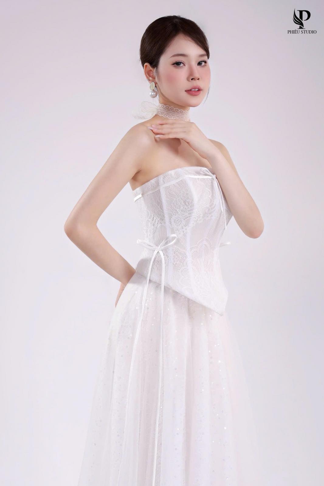 Như ánh ban mai khẽ chạm lên cánh hoa, SERAPHINE bước vào không gian cưới với dáng ren mềm mại, ôm lấy từng đường nét thanh thoát. Thiết kế trễ vai kết hợp corset tôn dáng, mang đến vẻ kiêu sa nhưng vẫn giữ được sự dịu dàng.