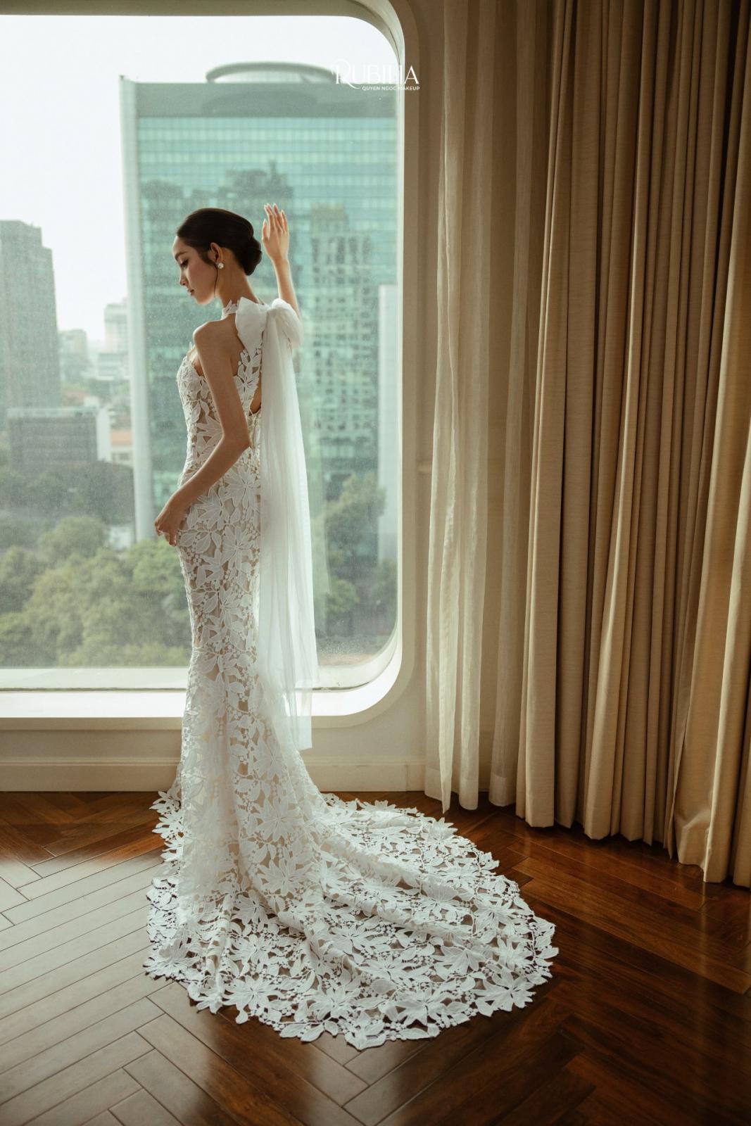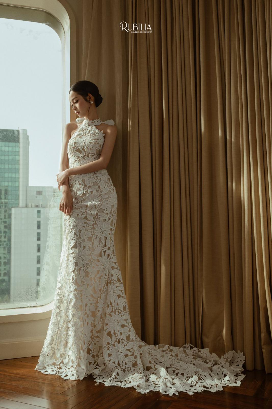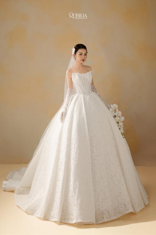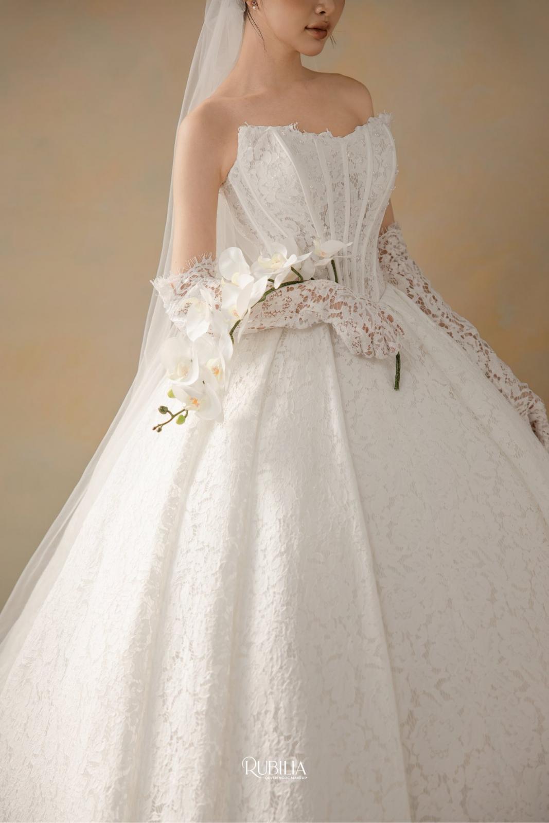 Từng đường corset ôm lấy vóc dáng mềm mại, cùng chất liệu ren phủ xuyên suốt từ thân đến tùng váy, mang lại cảm giác thanh lịch, kiêu sa nhưng vẫn dịu dàng và đầy sức hút.