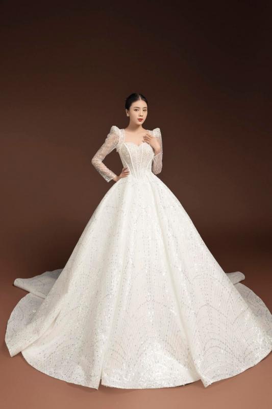 Lộng lẫy, nổi bật nhưng vẫn phải thật tinh tế - đó là những gì Thuý Hiệu hướng đến để tạo nên chiếc váy cho ngày trọng đại của nàng. Và sự lựa chọn của NTK TH đó chính là một thiết kế ball-gown kinh điển, nhưng thay vì họa tiết phù điêu hay baroque, chiếc váy được phủ lên 1000 viên swarovski Chính điều này đã khiến cho chiếc váy tỏa sáng trong mọi khung hình, đồng thời mang vẻ sang quý một cách thanh tao và nhẹ nhàng.