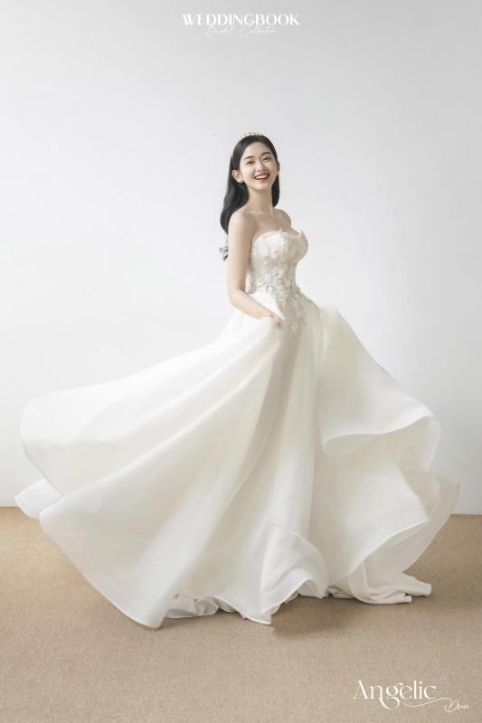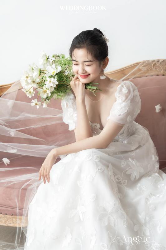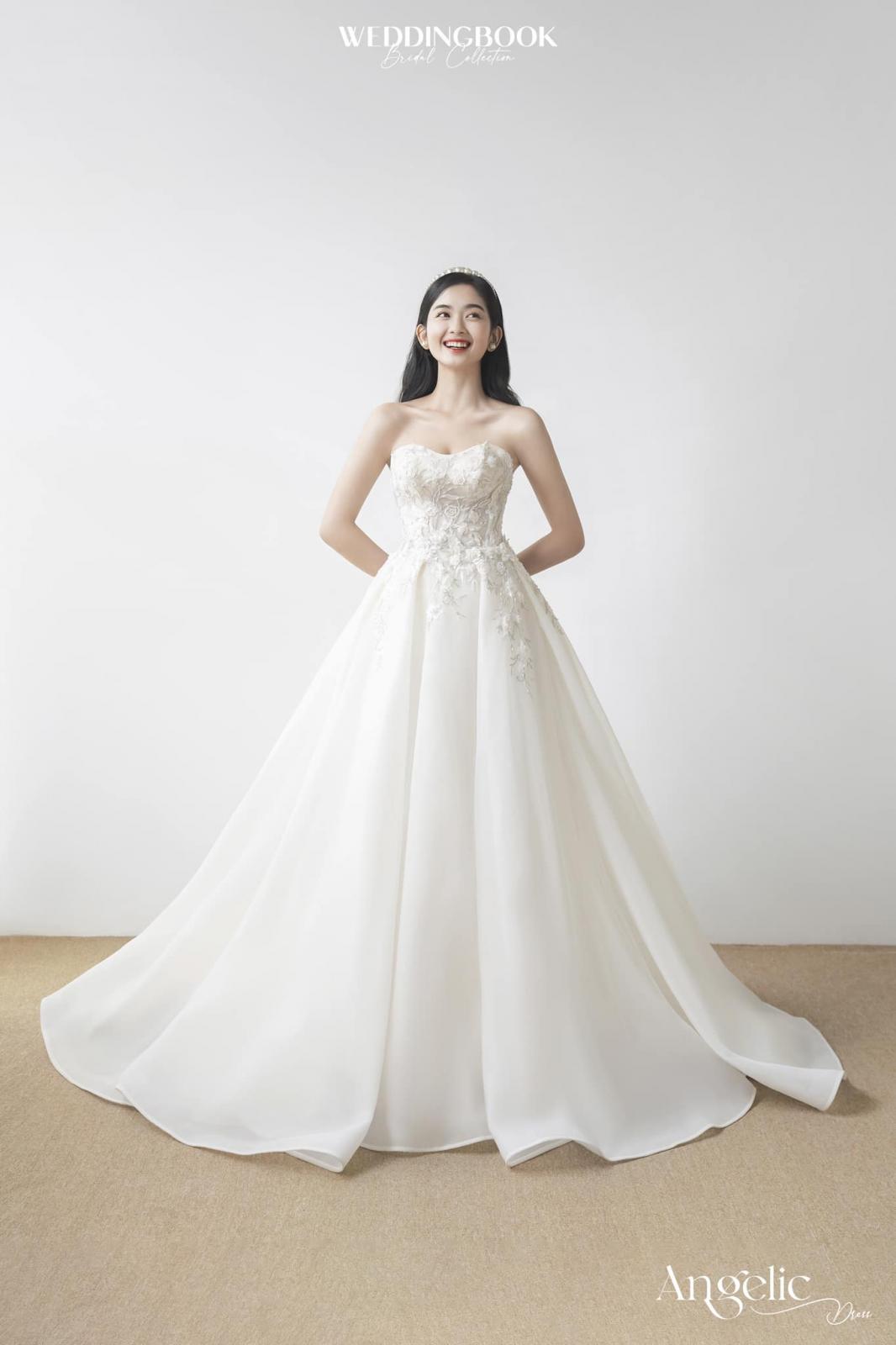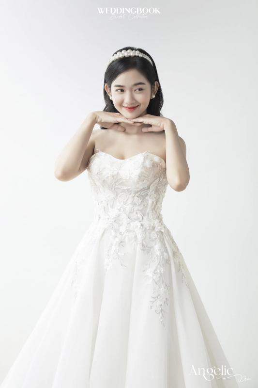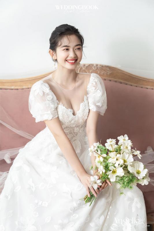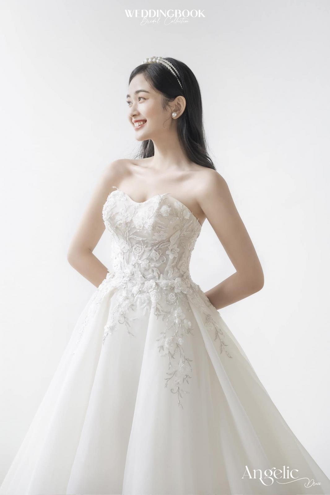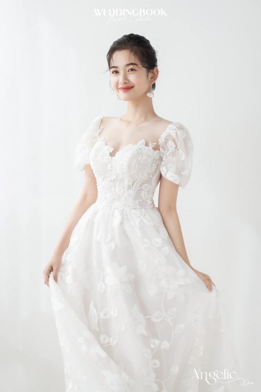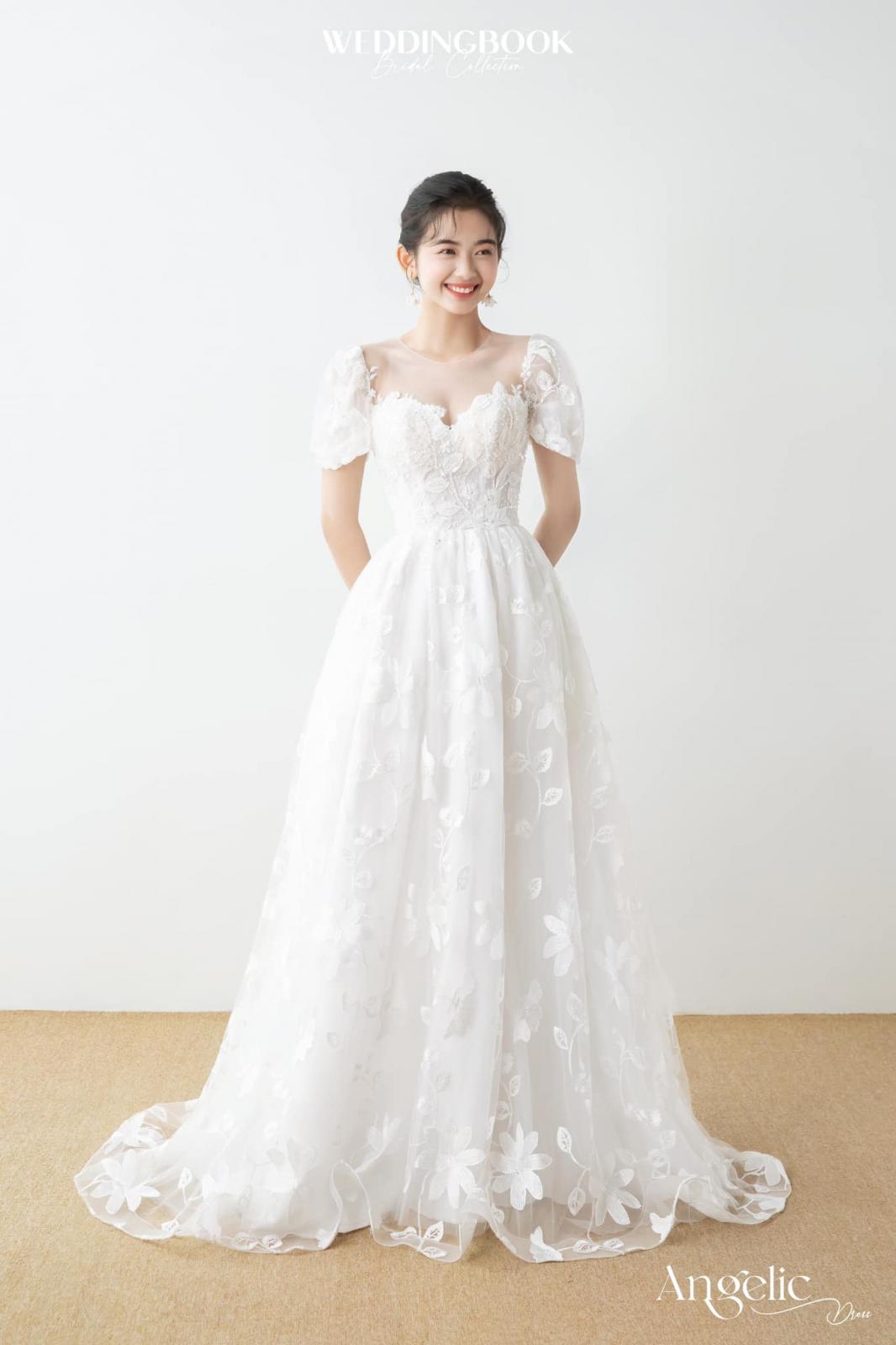 Đúng với tên gọi Angelic, kiểu dáng A-line tay phồng kết hợp cùng chất liệu voan thêu hoa mềm mại sẽ làm tăng thêm sự thanh thoát cho bạn trong ngày cưới.